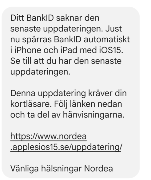 Klicka inte på länken i detta sms utan radera meddelandet direkt. Korrekt information finns på Nordeas hemsida, sök där efter Mobilt BankID.