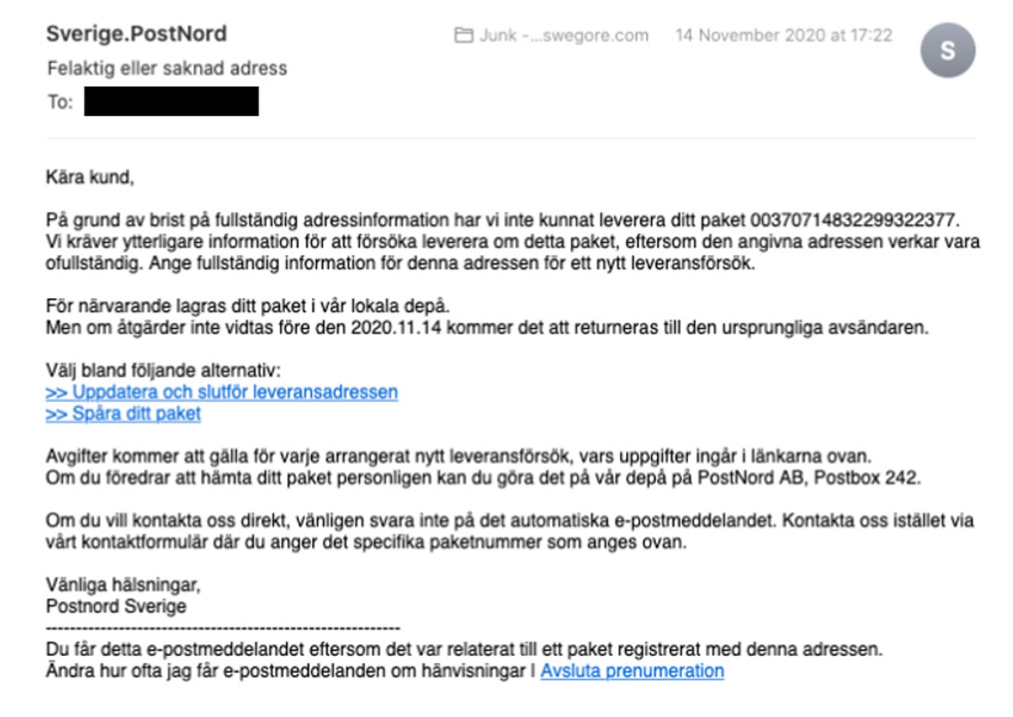 Ny phishingvåg med Postnord som avsändare