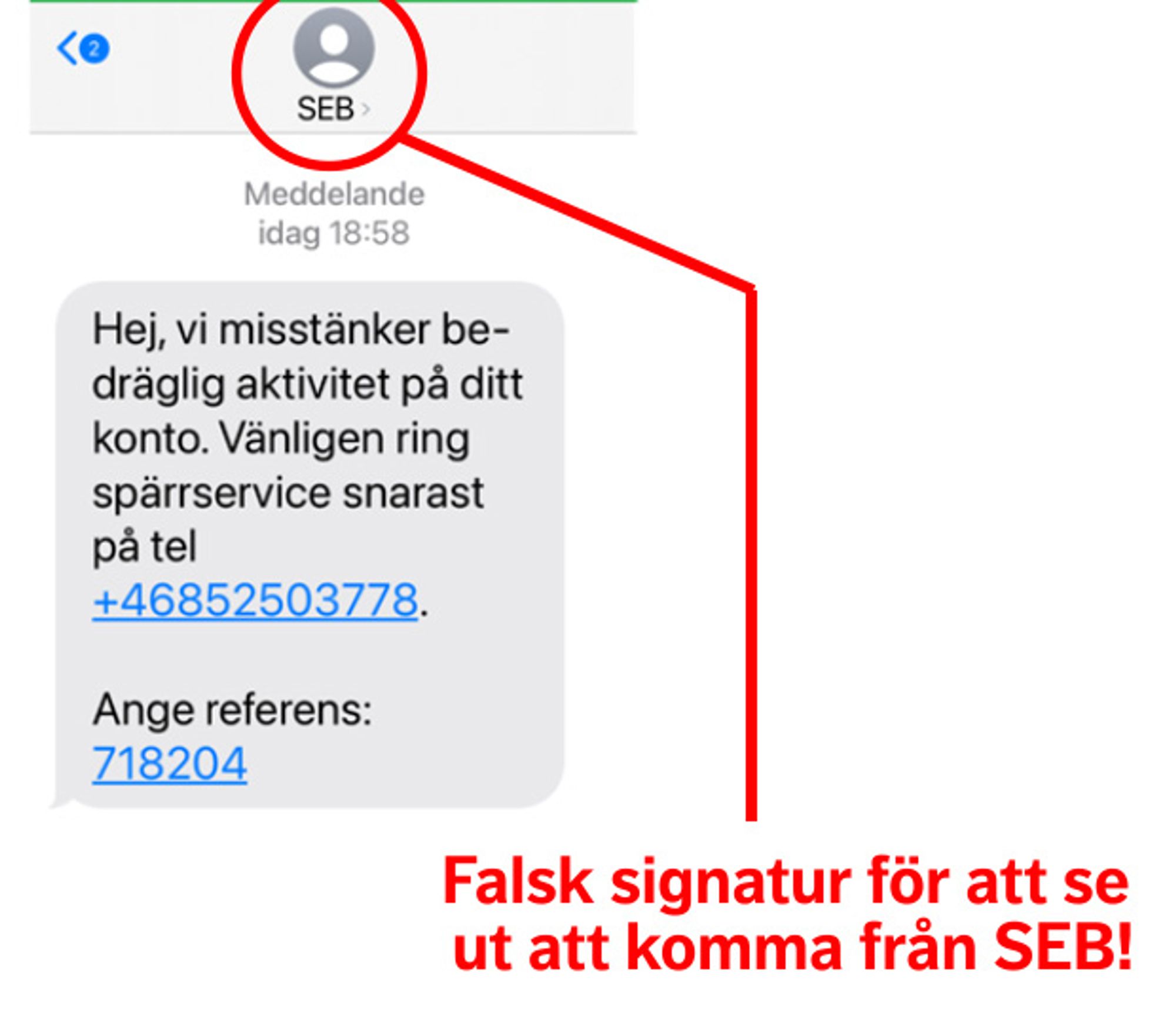 Ett flertal personer har fått sms som ser ut att komma från SEB. På grund av "bedräglig aktivitet på ditt konto" uppmanas mottagaren att ringa angivet telefonnummer samt ange ett referensnummer. Observera att bedragarna kan alternera angivet telefonnumret, referensnumret har i dessa fall varit detsamma, men även detta kan ändras.